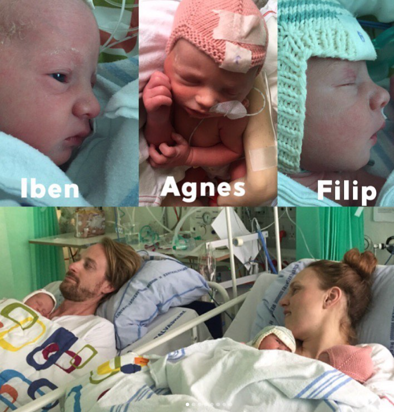 Less than a day after the viral wave peaked, Maria and her husband Anders welcomed their three babies into the world: Iben, Agnes, and Filip.